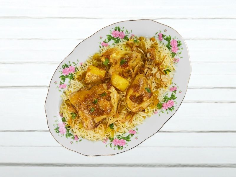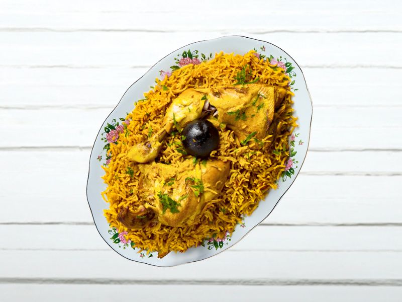 Fresh chicken cooked with rice and gulf spices served with yogurt.