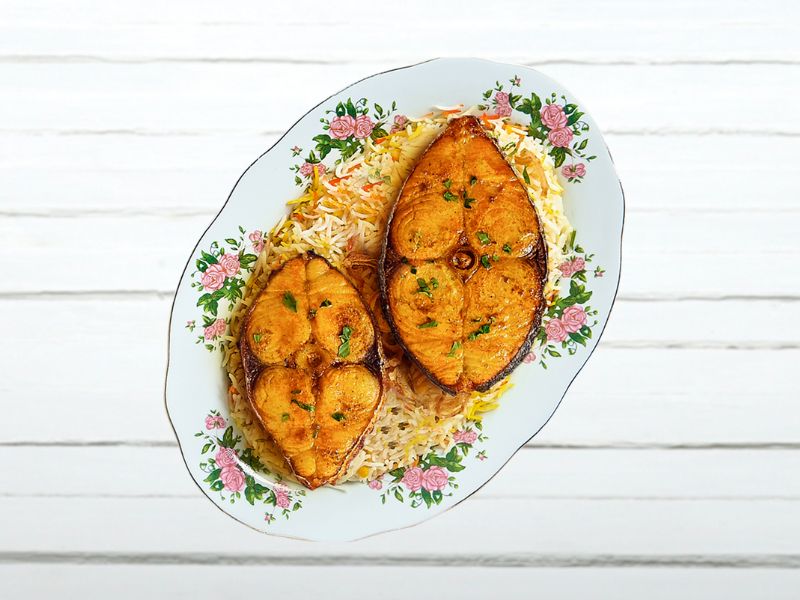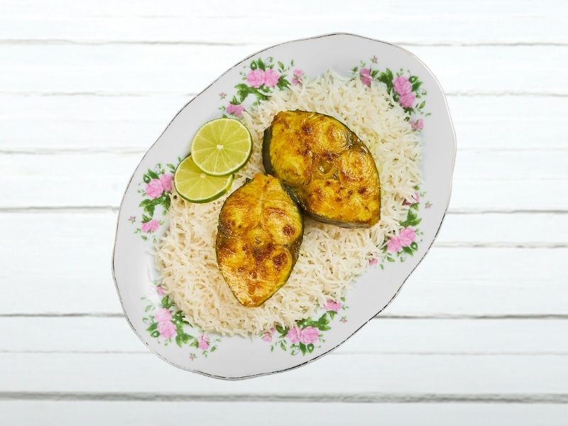 Fresh kingfish cooked with tomato sauce, Gulf spices,potato and white rice.