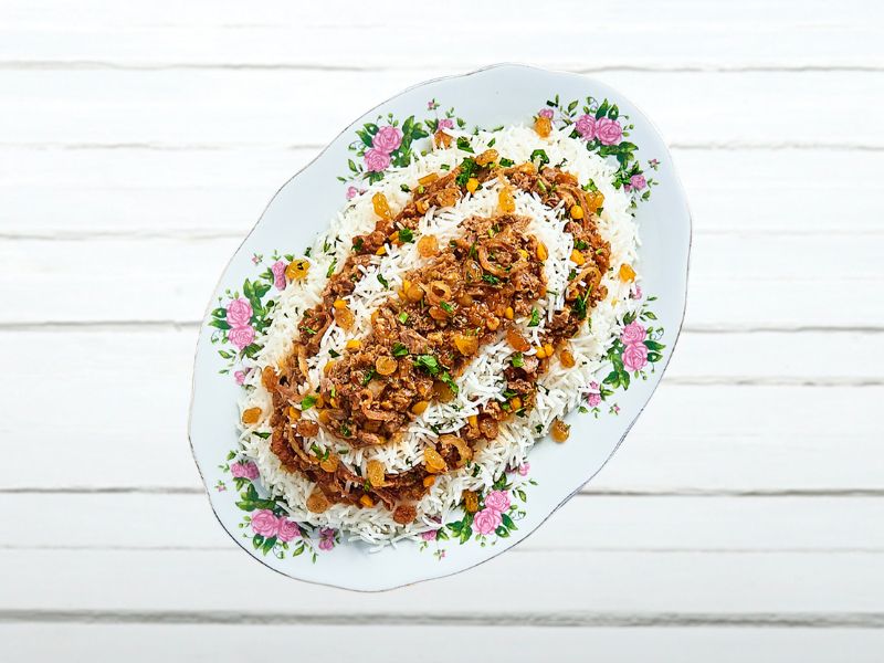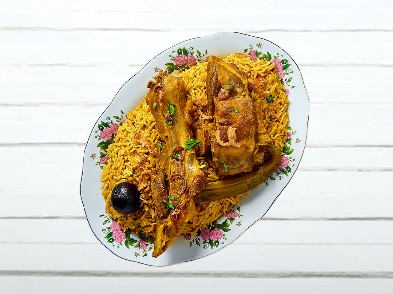 Tender shredded lamb cooked in Emirati spices served between two layers of white rice and topped with caramelized onions, fresh coriander leaves, and dried raisins served with yogurt.
