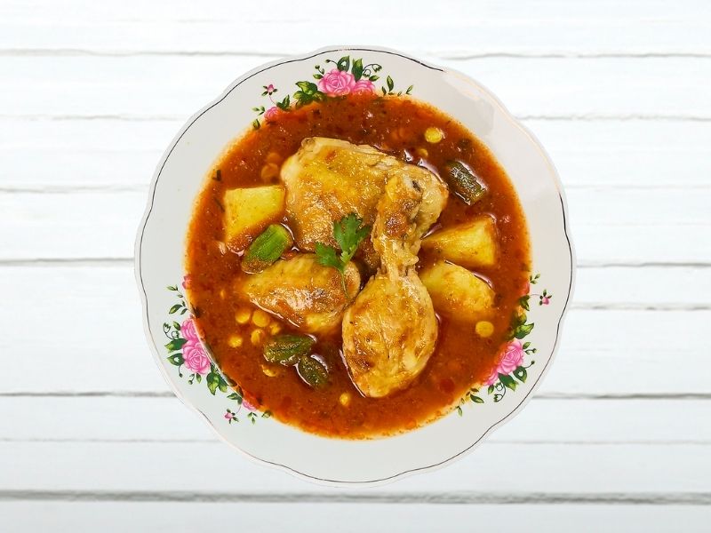 Fresh Chicken in traditional way with tomato, potato, cilantro, onion, lentils, gulf spices served with white rice or tanoor bread.